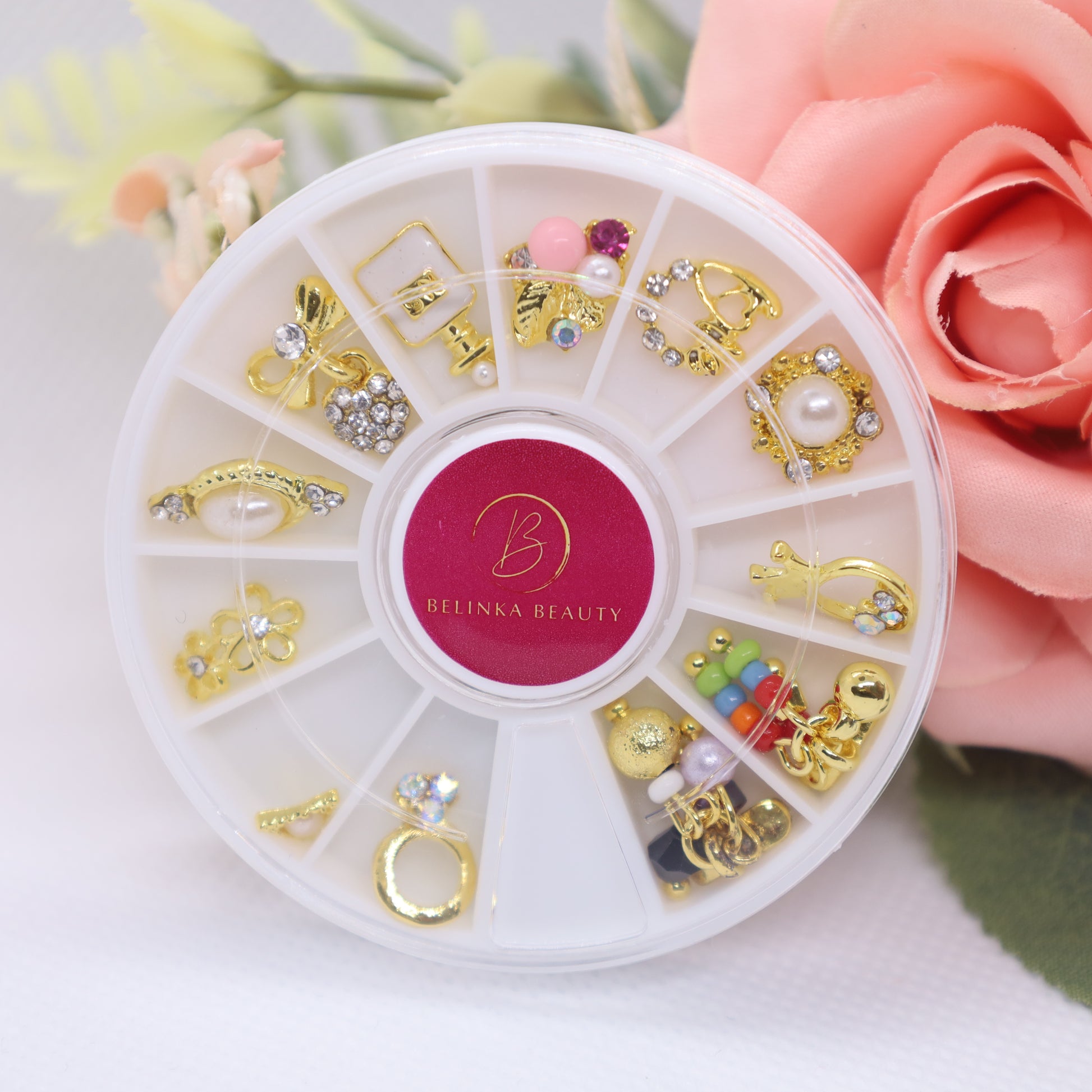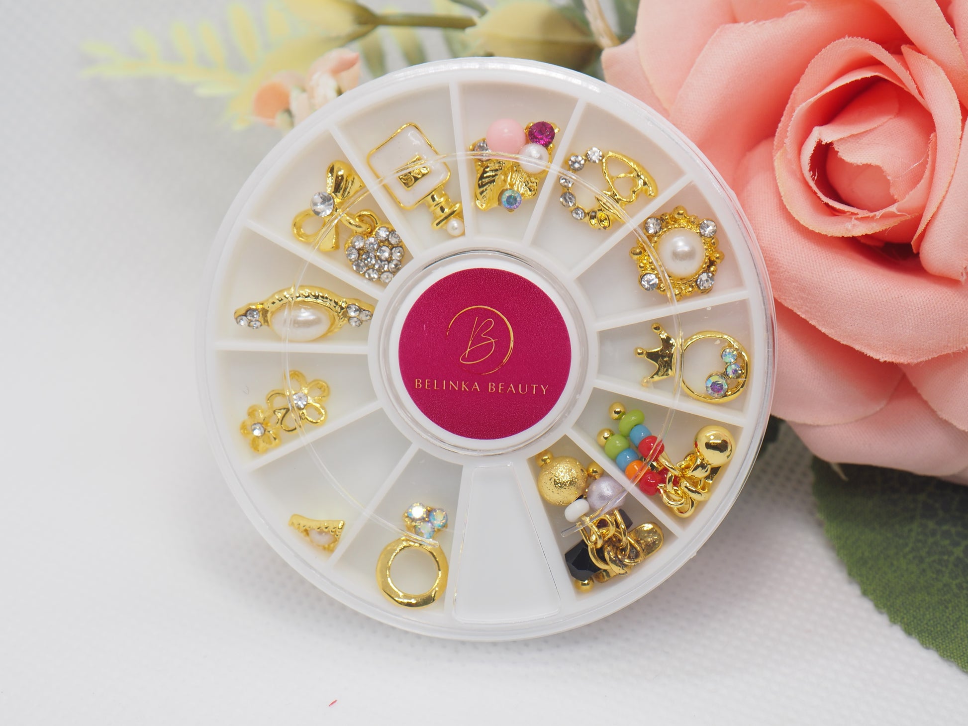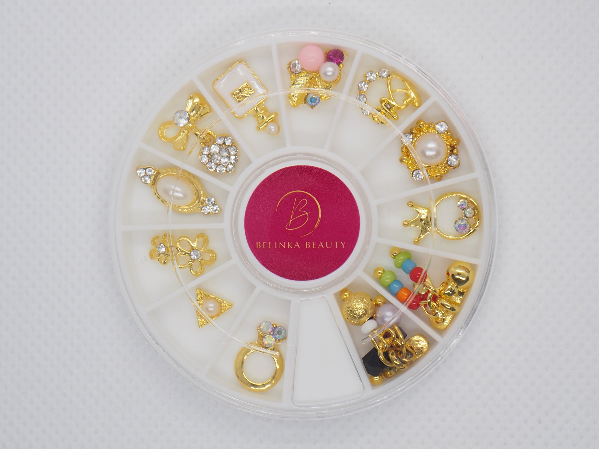 The carousel contains 12 beautiful pieces of high quality nail jewelry. They are gently rounded from the bottom to better fit the nail. Stones of various types and sizes have a bright and clear appearance and a diamond-like cut that casts significant reflections. The mixture of high-quality metals guarantees that the jewelry will remain shiny and bright for a long time without significant color changes. It doesn't darken, it doesn't blacken, it doesn't tarnish, and above all, it stays beautiful until the next nail makeover (using our Iconic Fixing gel).