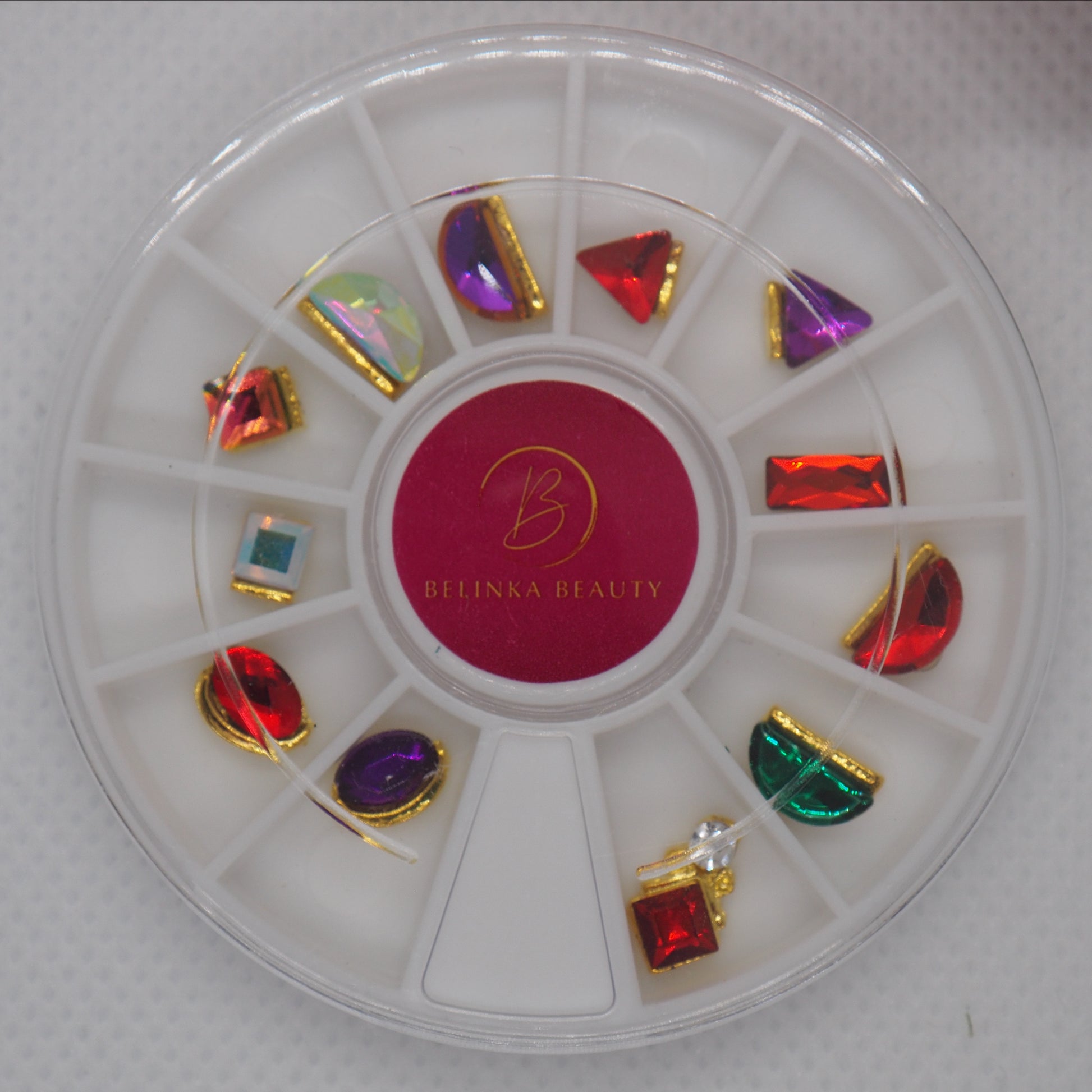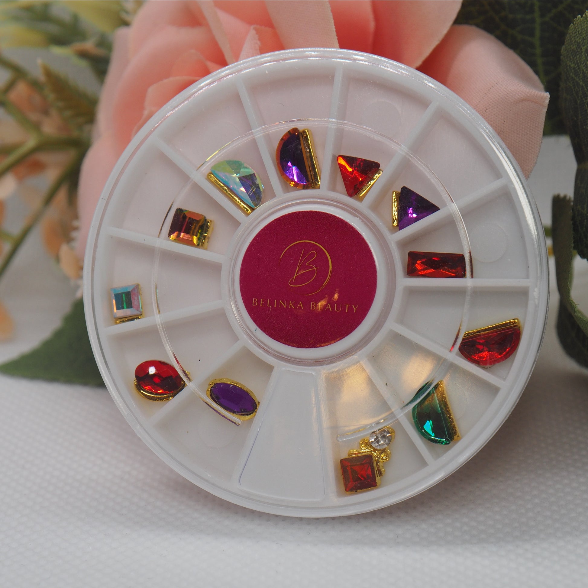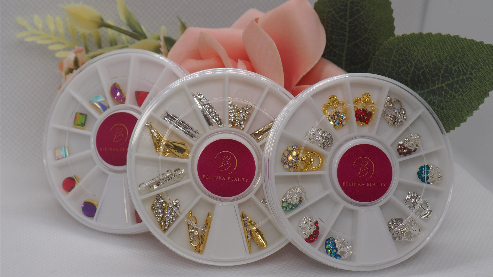 The carousel contains 12 beautiful pieces of high quality nail jewelry. They are gently rounded from the bottom to better fit the nail. Stones of various types and sizes have a bright and clear appearance and a diamond-like cut that casts significant reflections. The mixture of high-quality metals guarantees that the jewelry will remain shiny and bright for a long time without significant color changes. It doesn't darken, it doesn't blacken, it doesn't tarnish, and above all, it stays beautiful until the next nail makeover (using our Iconic Fixing gel).